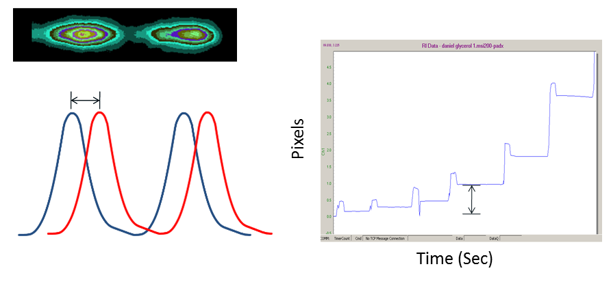 When molecular complexes form, they cause a measurable change in mean polarizability within the channel, which in turn causes the fringes to shift their position (move to the left or move to the right; see figure above). A proprietary algorithm is applied to determine minute changes in fringe position among the various frequencies which comprise the fringe array. The output of the system is a time dependent plot of fringe position that is translated into binding response.